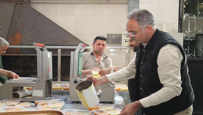 Şanlıurfa Eyyübiye Belediye Başkanı Mehmet Kuş, Ramazan ayı boyunca her gün 1050 kişiye dağıtılacak iftarlıklar için gönüllü personellerle birlikte mutfağa girdi. sosyal yardım çalışmalarına aralıksız devam eden Eyyübiye Belediyesi Ramazan ayı boyunca da her gün 1050 ailenin evine iftarlıklarını götürüyor. Hayırsever bir vatandaş tarafından tahsis edilen mutfakta gönüllü personellerle birlikte hazırlanan iftarlıklar, Eyyübiye Belediyesi araç ve personeliyle ailelere teslim ediliyor. Bin ailenin iftarlıkları Eyyübiye Belediyesi 50 ailenin ise Başkan Kuş tarafından karşılanıyor. Gün boyunca hummalı bir şekilde hazırlanan yemeklerin yapılışına ve hazırlanışına katılıp, soluğu mutfakta alan Başkan Kuş,” Kardeşlerimizle birlikte kalplere dokunmak için mutfaktayız.” Dedi.