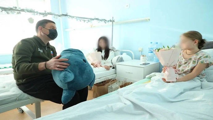 Andrei Turchak ve Vyacheslav Gladkov, 30 Aralık’ta Belgorod’daki bir hastanede bombardıman sırasında yaralanan çocukları ziyaret etti
