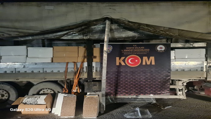 Konya Emniyet Müdürlüğü’ne bağlı Kaçakçılık ve Organize Suçlarla Mücadele Şube Müdürlüğü ekiplerince Çevreyolu üzerinde yapılan uygulamada şüphe üzerine bir tır durduruldu. Polis ekiplerince yapılan aramada, gıda kolisi görünümü verilen yüzlerce kolinin içerisinde piyasa değeri 7.5 milyon TL olan 5.3 milyon adet doldurulmuş kaçak sigara ele geçirildi.