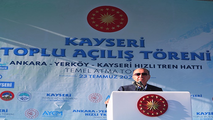 Cumhurbaşkanı Recep Tayyip Erdoğan, Cumhuriyet Meydanı’nda düzenlenen Kayseri Toplu Açılış Töreni ve Ankara-Yerköy-Kayseri Hızlı Tren Hattı Temel Atma Töreni’ne katılarak bir konuşma yaptı.